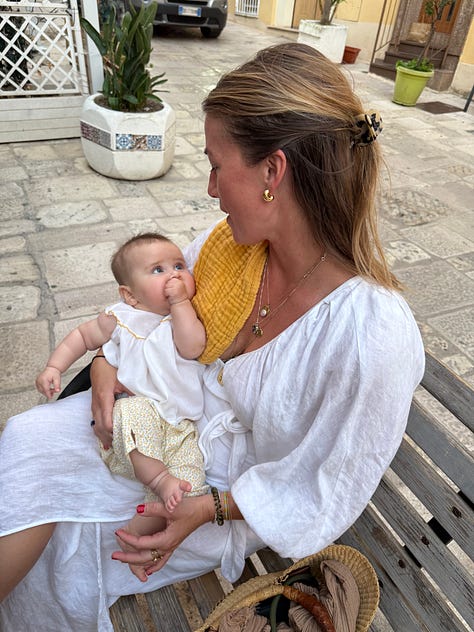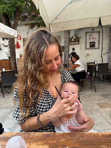 We swam at glorious beach clubs with crystal clear waters and Aperol spritzes you ordered on your phone. Alex joined us at the masseria after our full throated endorsement. She and Tiff went hog wild in Grottaglie, the “ceramics town” of Puglia. I enjoyed an ice cold Peroni and a normal acting baby.